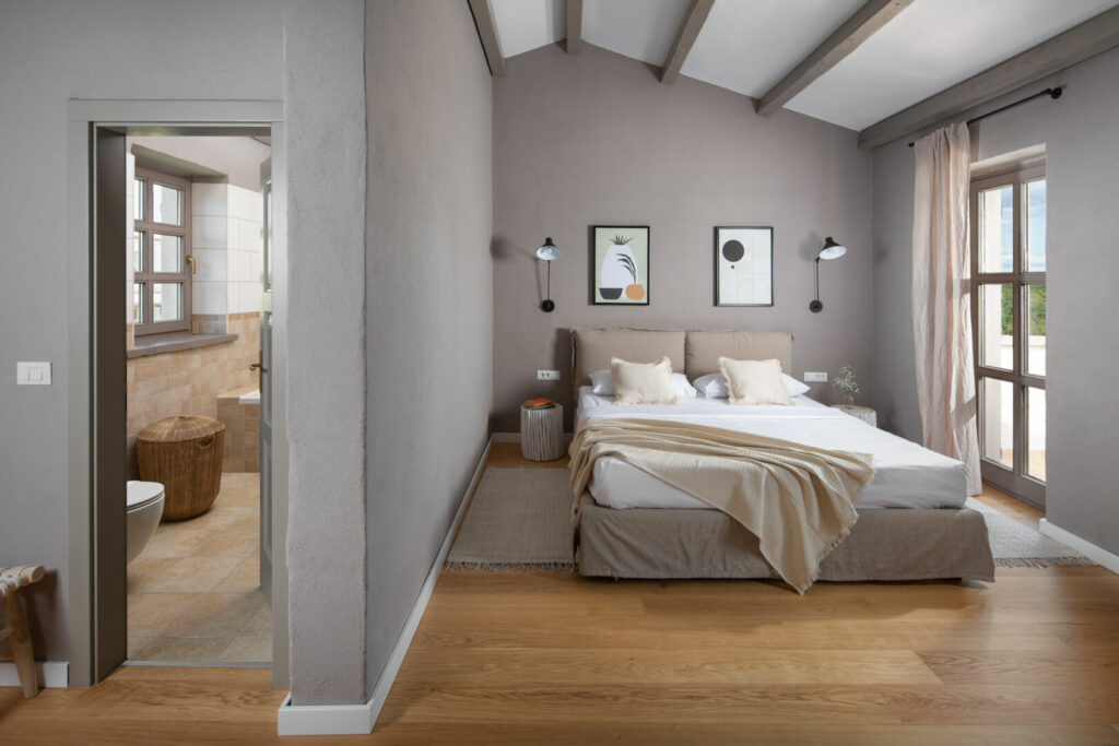 Vila se sastoji od prizemlja i kata, opremljena je sa moderno dizajniranim namještajem, a spavaće sobe su opremljene kao kombinacija kreveta samaca i bračnih kreveta. Kuhinja je potpuno opremljena, a od dnevnog boravka i blagovaonice dijeli je kuhinjski šank. Blagovaonica je opremljena za osam osoba i ima izlaz na natkrivenu terasu. U prizemlju se nalazi jedna spavaća soba sa izlazom na natkrivenu terasu. Pored spavaće sobe nalazi se kupaonica s tušem. Unutarnje stepenice vode na prvi kat na kojem su smještene tri spavaće sobe. Sve sobe imaju privatne kupaonice i privatne balkone.