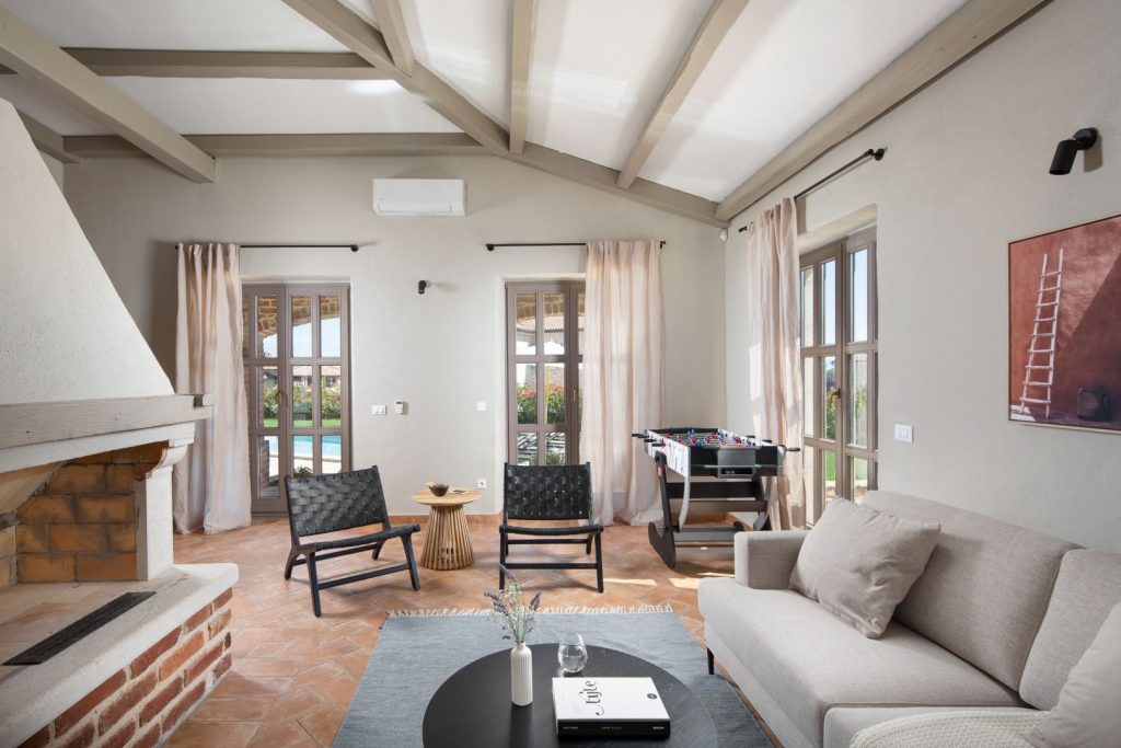 Vila se sastoji od prizemlja i kata. Dugačak otvoreni prostor potpuno opremljene kuhinje i blagovaone za osam osoba nastavlja se na dnevni boravak L oblika sa otvorenim kaminom. Uzdužno dnevnih prostorija nalazi se natkrivena terasa s koje se pruža predivan pogled na sunčalište i bazen.