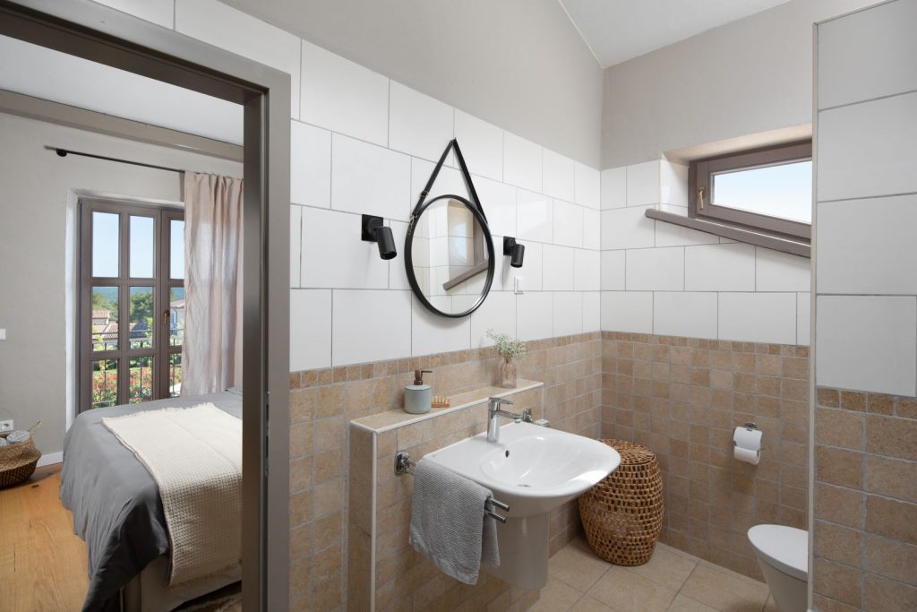U prizemlju su smještene dvije spavaće sobe, svaka na jednoj strani vile što daje dodatnu privatnost svim stanarima vile. Prva spavaća soba ima privatnu kupaonicu s kadom i zidanom tuš kadom te izlazom u stražnje dvorište koje vodi na sunčalište. Druga spavaća soba u koju se spušta po stepenicama također ima privatnu kupaonicu s kadom i zidanom tuš kadom. Iz spavaće sobe izlazi se na sunčalište. Na katu se nalazi glavna spavaća soba i dodatna soba sa sofom na razvlačenje. Iz spavaće sobe izlazi se na balkon s kojeg se pruža pogled na sunčalište, cijelo naselje i more.